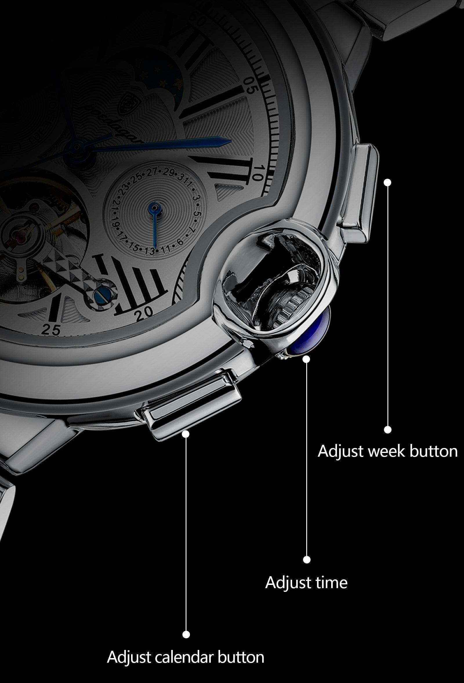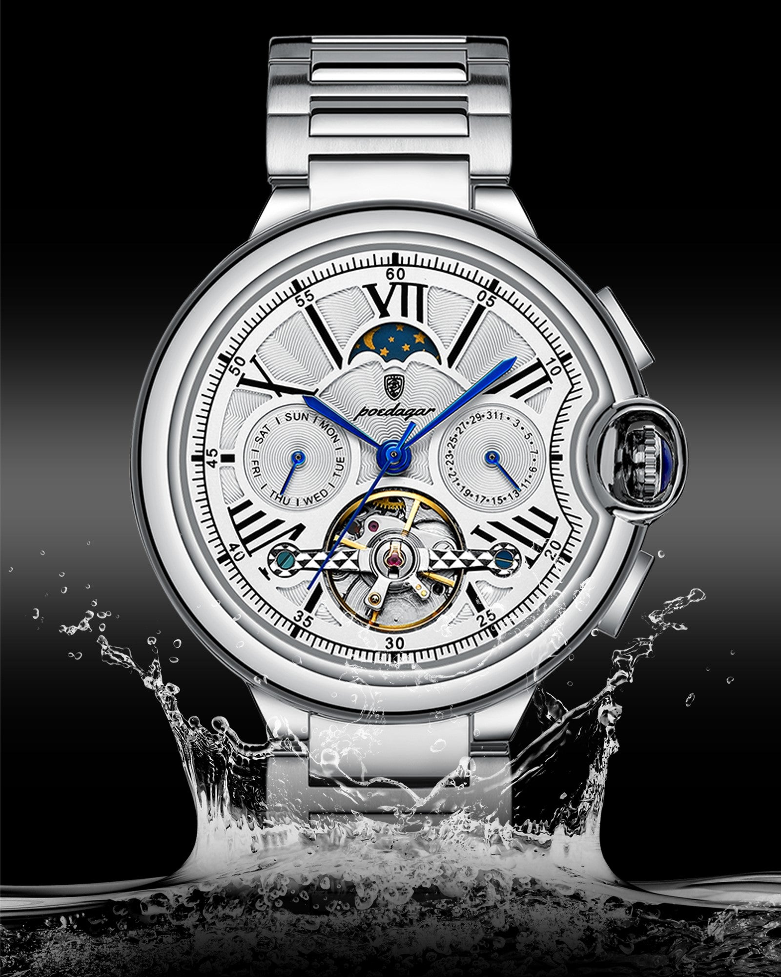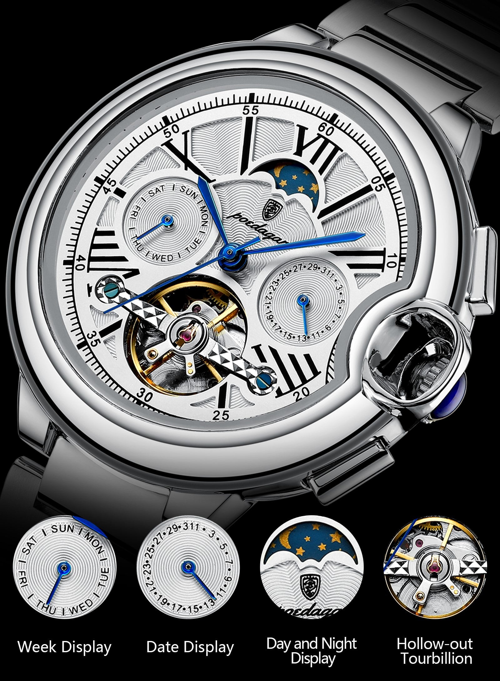 - Funciones: Calendario automático, día y fecha, tourbillon visible, tres subesferas funcionales, función luminosa